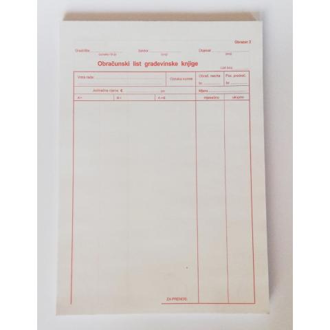 Title: Obrazac A4 MP Obračunski list građevinske knjige SKU: 016811 Brend: NNObrasci i formulariPrice: 3,50 € boja Quantity Stock: 5.00