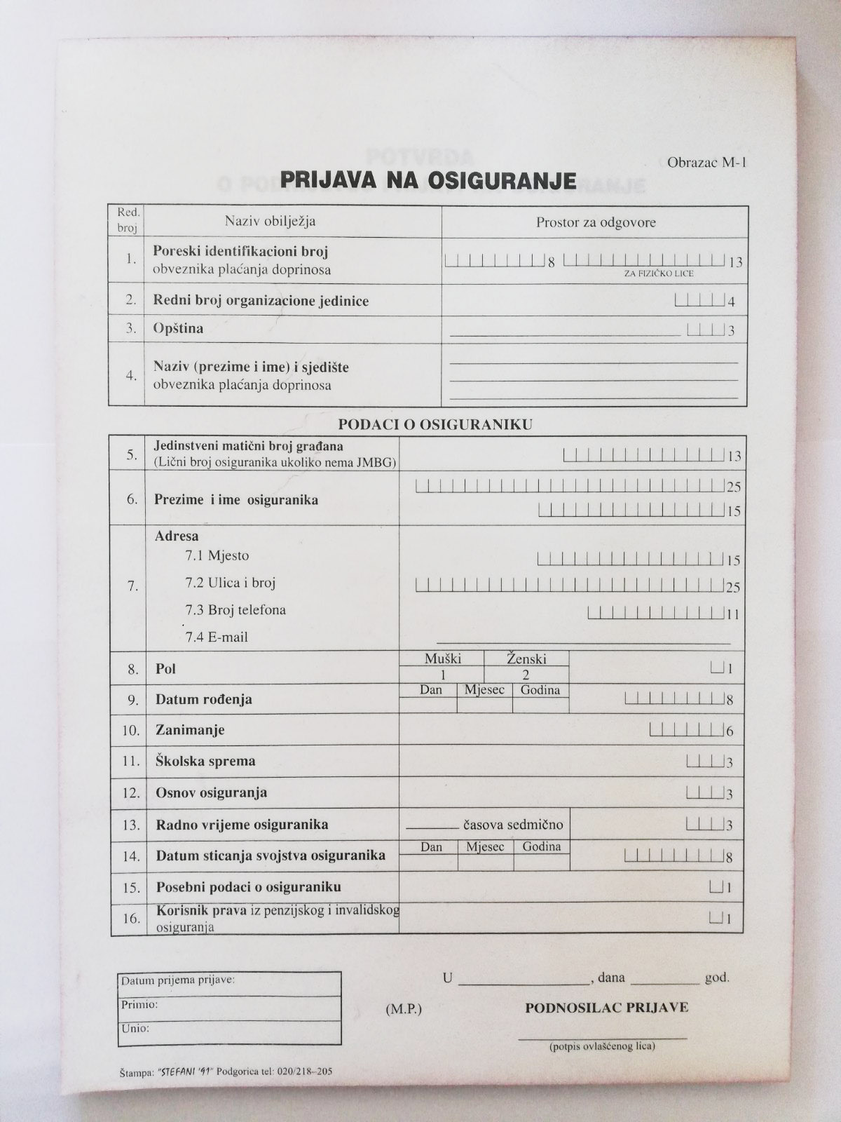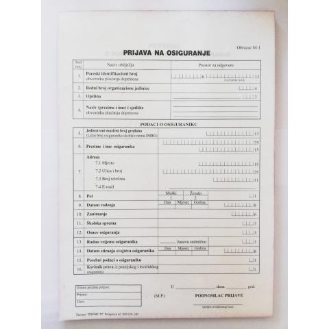 Title: Obrazac NCR A4 MP M1 Prijava na osiguranje SKU: 016812 Brend: NNObrasci i formulariPrice: 0,10 € boja Quantity Stock: 685.00